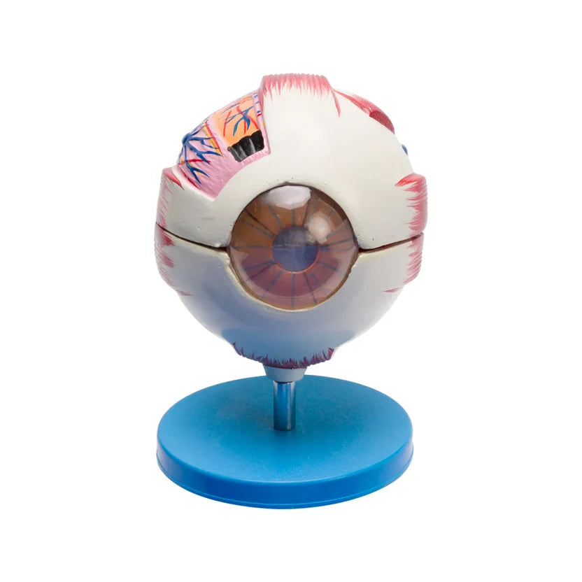 The model is highly magnified 6 times enlarged dissectable in 6 parts ideal with magnetic attachment for basic anatomical study of eye. Shows sclera, cornea, eye muscle attachments, iris, retina, optic nerve & vessels.