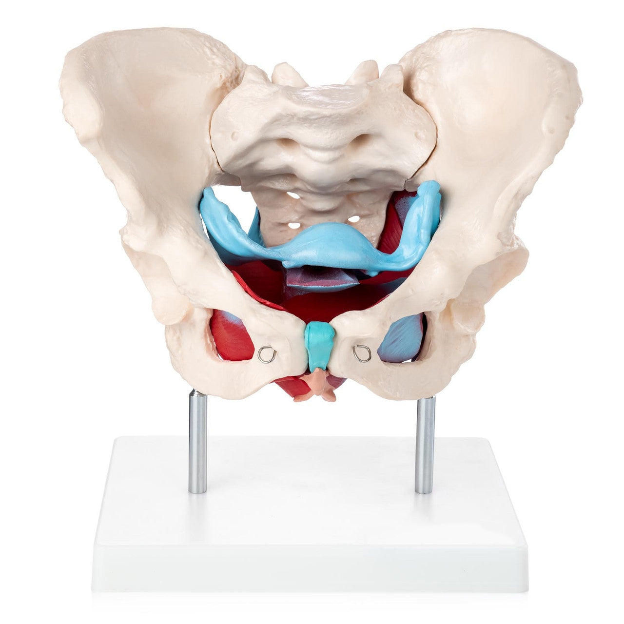 - Pelvic floor model shows the anatomy of the sacrum, pelvic floor muscles, uterus, ovaries, anus with rectum, vagina and pubic symphysis