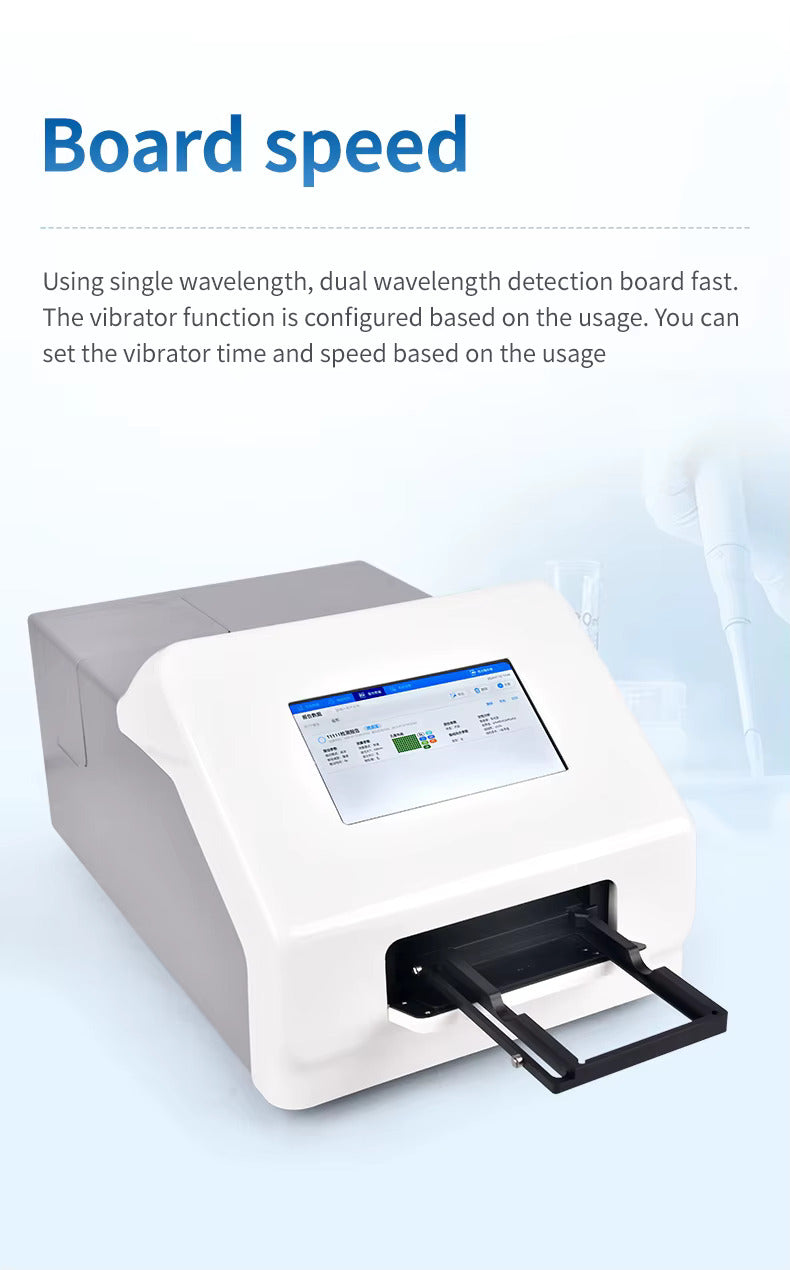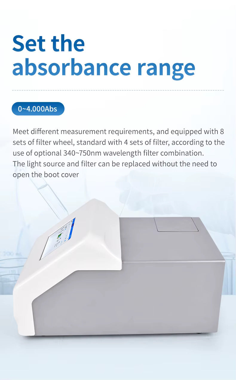 Microplate ELISA Reader with 0 - 4.000 Abs Range and ± 1% (0-3 Abs) at 405 nm, ± 2 % (3-4 Abs) at 405 nm Accuracy, ER-96, delivers precise absorbance measurements for quantitative analysis. Its wide dynamic range accommodates various sample concentrations, ensuring accurate results across different assay types. The high-precision optics and stable light source enhance measurement consistency.