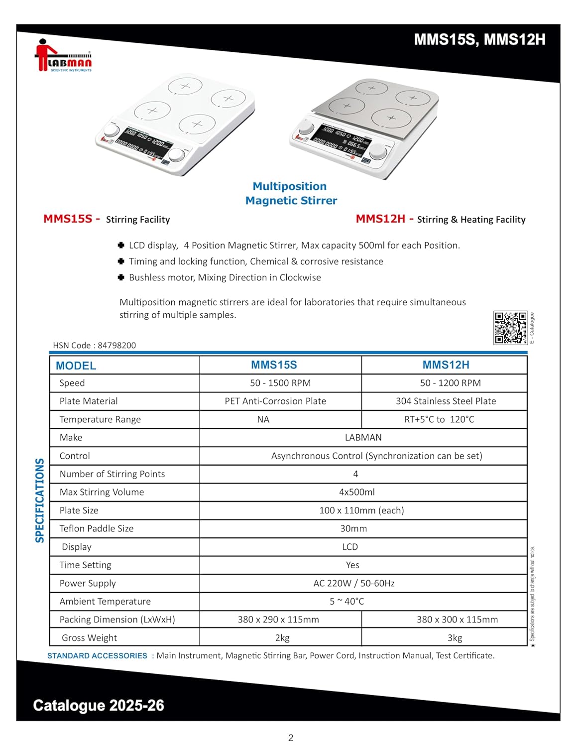 LCD display, 4 Position Magnetic Stirrer, Max capacity 500ml for each Position. Timing and locking function, Chemical & corrosive resistance Bushless motor, Mixing Direction in Clockwise