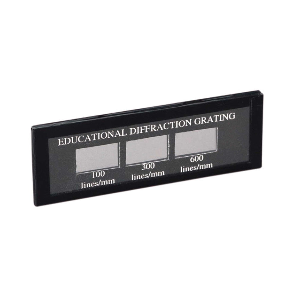 For demonstrating the principle of the diffraction grating and the way in which its properties are dependent upon the number of lines per unit length. Comprises a card mount 90 x 40 mm approximately with three 16 x 9 mm apertures, each containing a diffraction grating replica. The gratings are of 100 lines/ mm. 300 lines/ mm and 600 lines/ mm, respectively, and are protected by cover glasses.