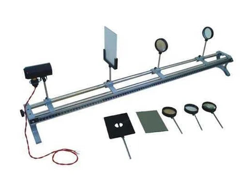 The bench has two steel rods, one of which is graduated in mm with heavy metal end supports with leveling screws with four metal slides that slide smoothly on the bench. Two of the slides have a transverse motion arrangement. Complete with two lens holders and two object needles.