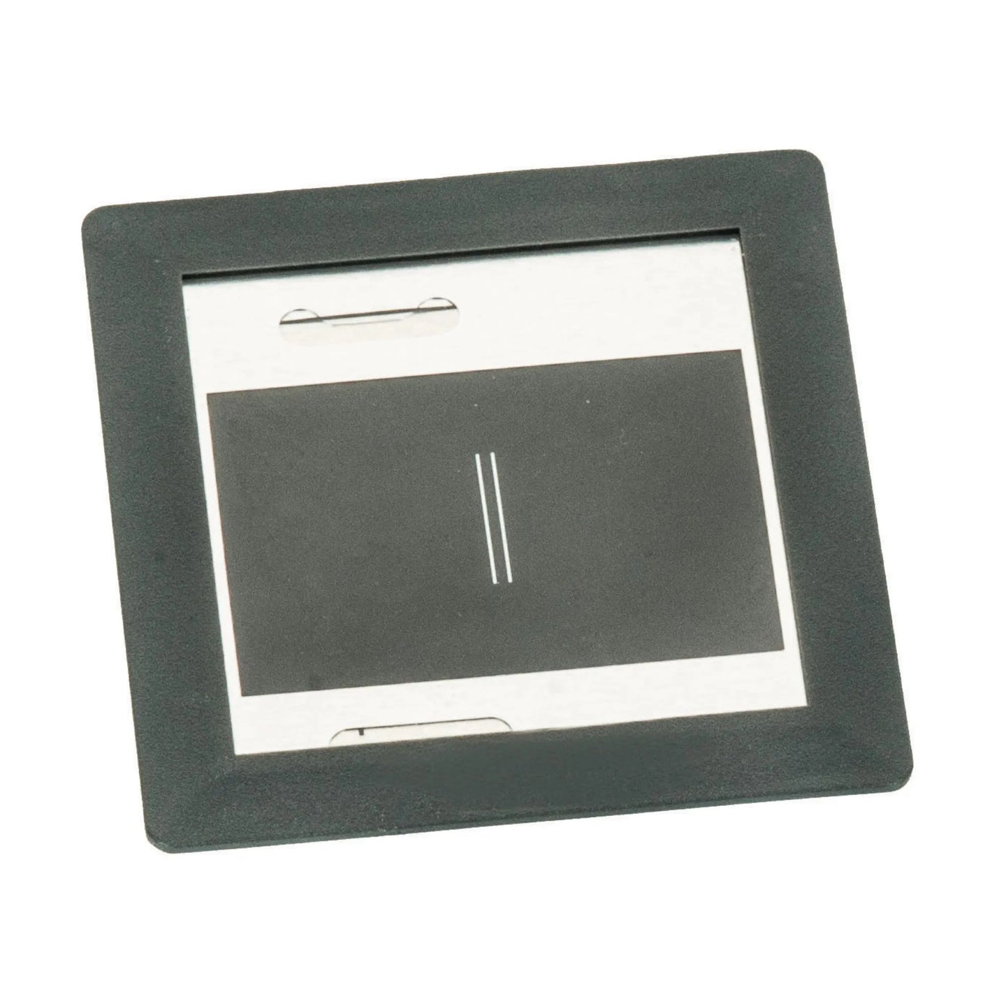 A double-slit 10 mm long x1 mm separation in 50 x 50 mm frame. Mounted in a channel with a hinged joint and micrometer screw to give fine adjustment. For observation of fringes produced by interference between two beams of light from a common source.