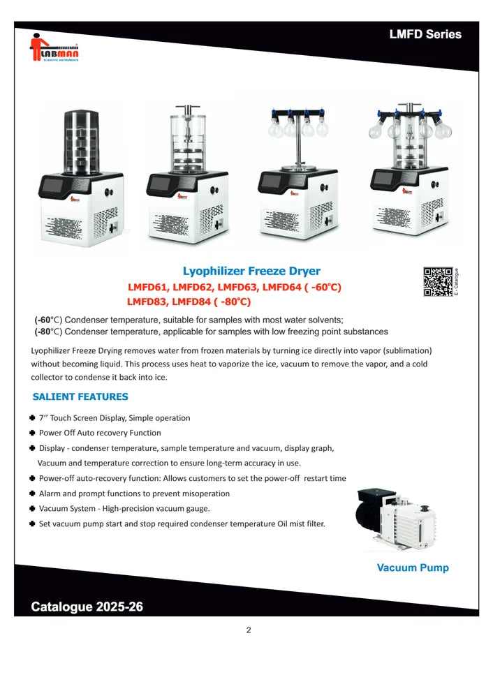 The LMFD61 Lyophilizer Freeze Dryer is a compact and efficient laboratory instrument designed for reliable freeze-drying (lyophilization) of heat-sensitive samples. It is widely used in pharmaceutical, biotechnology, food, and research laboratories.