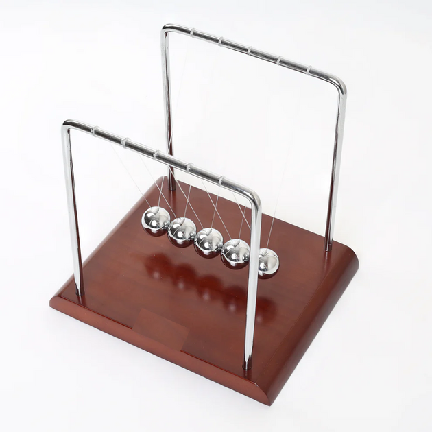 A Newton's Cradle is a device typically made of metal that demonstrates the principles of conservation of momentum and conservation of energy through the motion of swinging spheres.