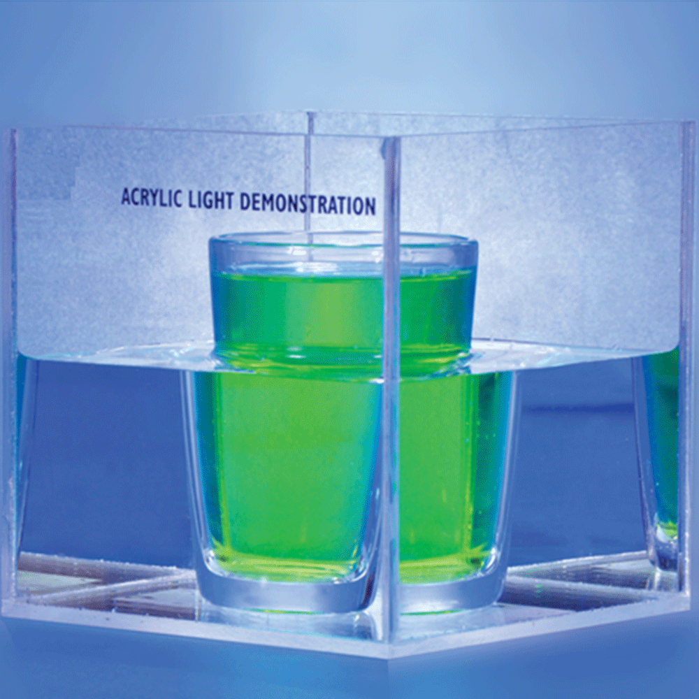 To demonstrate refraction and provides a better understanding of Snell's Law. Comprises of acrylic cube and a glass mug. Includes instructions.