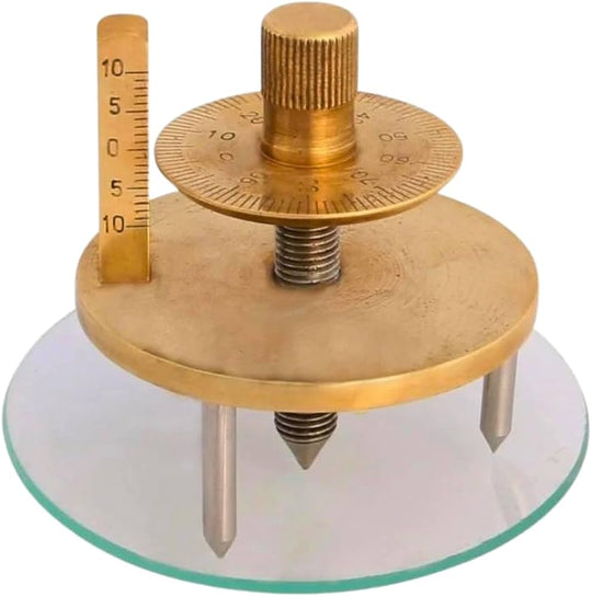 Description Spherometer (LO-392) Brass dial head 40 mm diam. divided and marked in 100 divisions, vertical scale 10-0-10 mm, fitted on heavy brass disc, with 3 pointed legs, distance between legs 40 mm. Screw pitch...Sale price Rs.732.00Regular price Rs.1,132.00 -