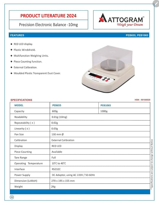 1 review→ RED LED display→ Plastic Windshield→ Multifunction Weighing Units→ Piece Counting function→ External Calibration→ Moulded Plastic Transparent Dust Cover. MODEL PEB655 PEB1065 Capacity 600g 1000g Readability 0.01g (10mg) Repeatability (...Sale price Rs.4,499.00Regular price Rs.8,000.00 -