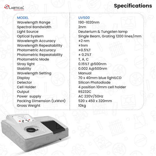 No reviewsLABTICAL UV-Vis. Single Beam Spectrophotometer - UV500 70 x 40mm blue light LCD display. Quantitative and Kinetics Test with Professional PC software. Automatically adjust 0% A and 100% T. Store 50 groups of measuring data. Wavelength...Sale price Rs.64,999.00Regular price Rs.85,000.00 -