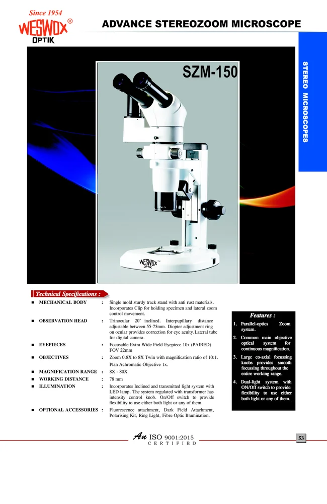 ILLUMINATION: Incorporates Inclined and transmitted light system with LED lamp. The system regulated with transformer has intensity control knob. On/Off switch to provide flexibility to use either both light or any of them.